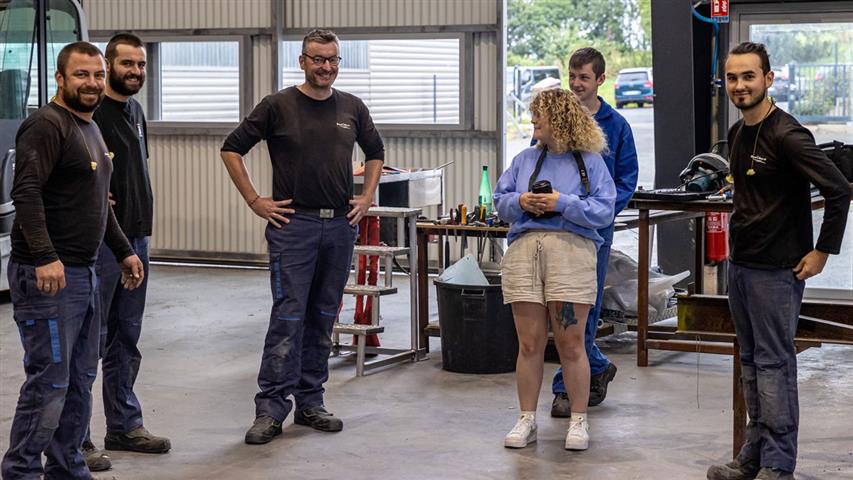 Une partie de l'équipe du chantier Bord à Bord après le retournement de la coque.