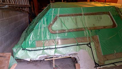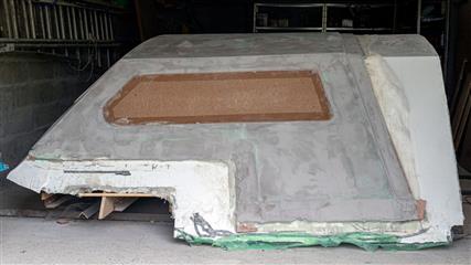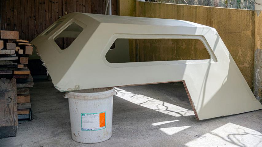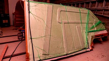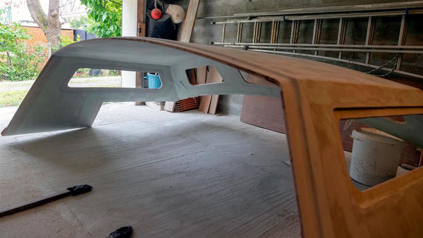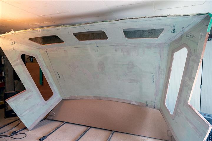 Nous avons réalisé un moule mâle étanche en contreplaqué et les étapes suivantes sous vide : stratification de trois couches de bibiais 600 g, collé une mousse de PVC de 25 mm d'épaisseur et les inserts en bois pour la fixation des hublots, stratifié à nouveau trois couches de bibiais 600 g pour la peau extérieure. Enfin enduit, ponçage, application d'une peinture époxy suivie de deux couches de peinture polyuréthane.