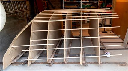 La construction avance bien. Les couples sont en place, les lisses posées, le puits de dérive installé. Le bordage des tôles de fonds a débuté.